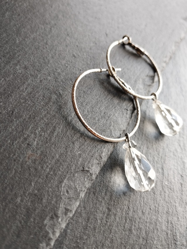 煌めくドロップカットのクリスタルと、サンドブラスト加工の華奢な輪っかのピアスです。 クリスタルチャームは全長約2センチ、 フープピアスの直径は約2.8センチになります。