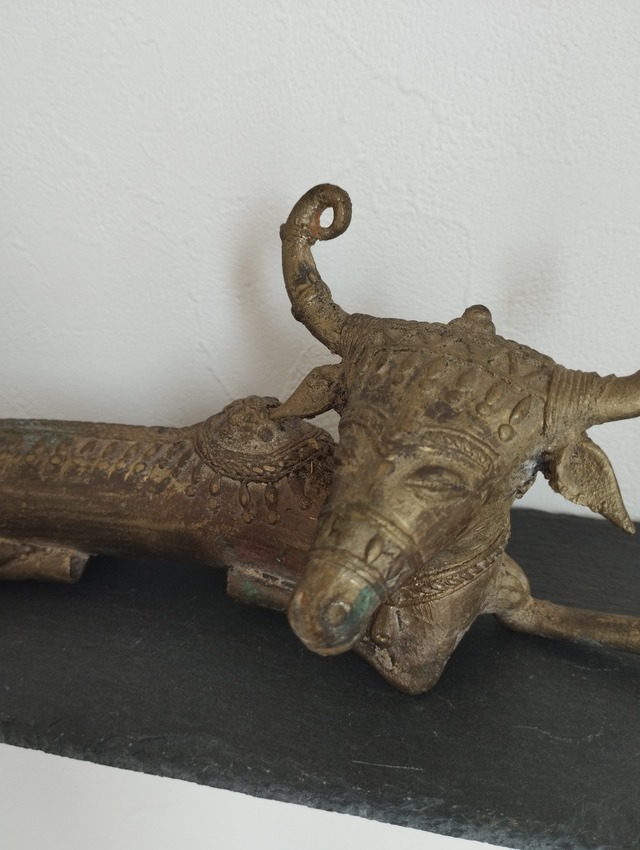 from:インド インドナショナルアワード受賞職人の作品です。 同じ職人の方から何点か購入し、こちらは保管していたものです。 柔らかい表情のあたたかみのある牛の像で、素朴な雰囲気です。