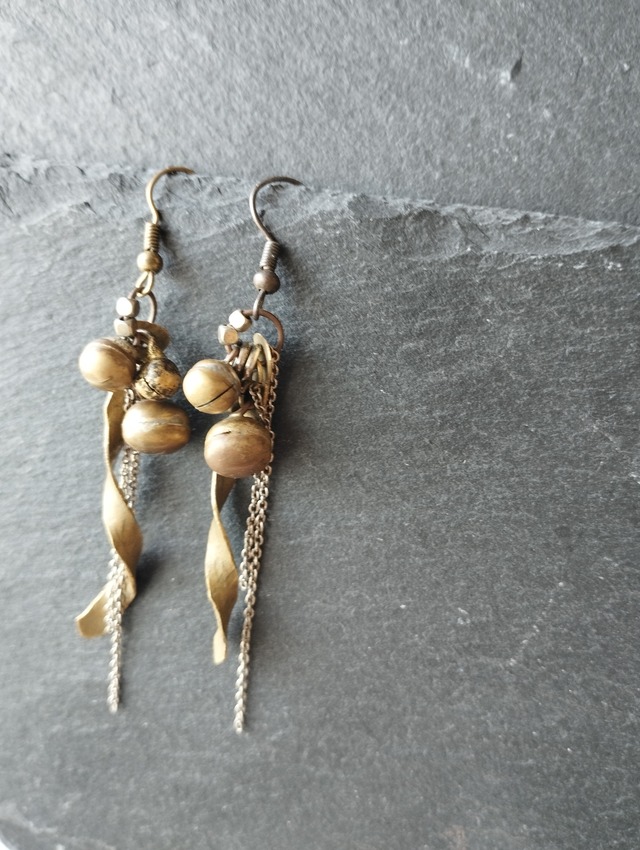 インドの職人さんが1点1点手作業でつくった真鍮のプレートと、タイの鈴などでつくったピアスです。 リボンのような波のような真鍮の揺らめきと、たくさんの実がなるような鈴たちがつくり出す素朴で味わい深い雰囲気がとても素敵です。