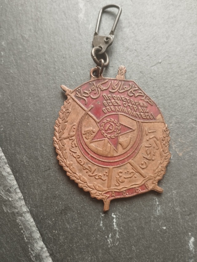 タジク自治共和国 記念章モチーフのキーホルダー 旧ソ連 海外の蚤の市で見つけた、 1920年代後半〜1930年代初期の タジク自治共和国(後のタジクSSR)初期の記念章関連のものと思われるキーホルダーです。 入手当時はキーホルダーの金具は付いていない状態で、新品の金具を自分で付けました。 サイズは大体ですが、横約4.5センチ、縦約5センチくらいです。 詳しくないので調べました。 以下AIによる解説です。 赤い三日月 五芒星 月桂冠 鎌とハンマー 「万国の労働者よ団結せよ」 タジク語(アラビア文字)タジキスタンは現在はキリル文字ですが、 初期ソ連期(1920年代頃)にはアラビア文字を使っていました。 ペルシャ系のタジク語をアラビア文字で書いたものです。 これは間違いなく ・旧ソ連 ・ タジキスタン関係 の意匠です。 中央の赤い帯に «Пролетарии всех стран, соединяйтесь!» と書かれています。 「万国の労働者よ、団結せよ!」 というソ連共通のスローガンです。 裏面に刻印なし、番号なし、メーカー刻印なし、 平滑でシンプルな地金(磁石がくっつくということなのでほぼ鉄) という特徴から、 初期の地方自治共和国レベルの記念章(1920年代)か、 後年に作られたレプリカや記念メダルと思われます。 裏面の簡素さから見ると、 公式国家勲章というより記念章・複製品の可能性が高めです。 ただし、タジクSSR初期の資料は非常に少ないため断定はできません。 磁石がくっつく → ほぼ鉄製 1920年代のソ連・タジクSSR系の正式勲章は基本的に真鍮・銀製で、 鉄製はほぼありません(戦時の簡易章でも鉄むき出しは稀)。 今回のものは 磁石に反応する(=鉄系) 裏面が完全に無刻印 サイズ約5cm(やや大きめ) 安全ピン式ではなくキーホルダー金具 この条件だと、 可能性が高いのはやはり後年のレプリカ等だと思われます。 #タジキスタン#ソビエト連邦#ソ連#アラビア語#タジク語#勲章コレクション