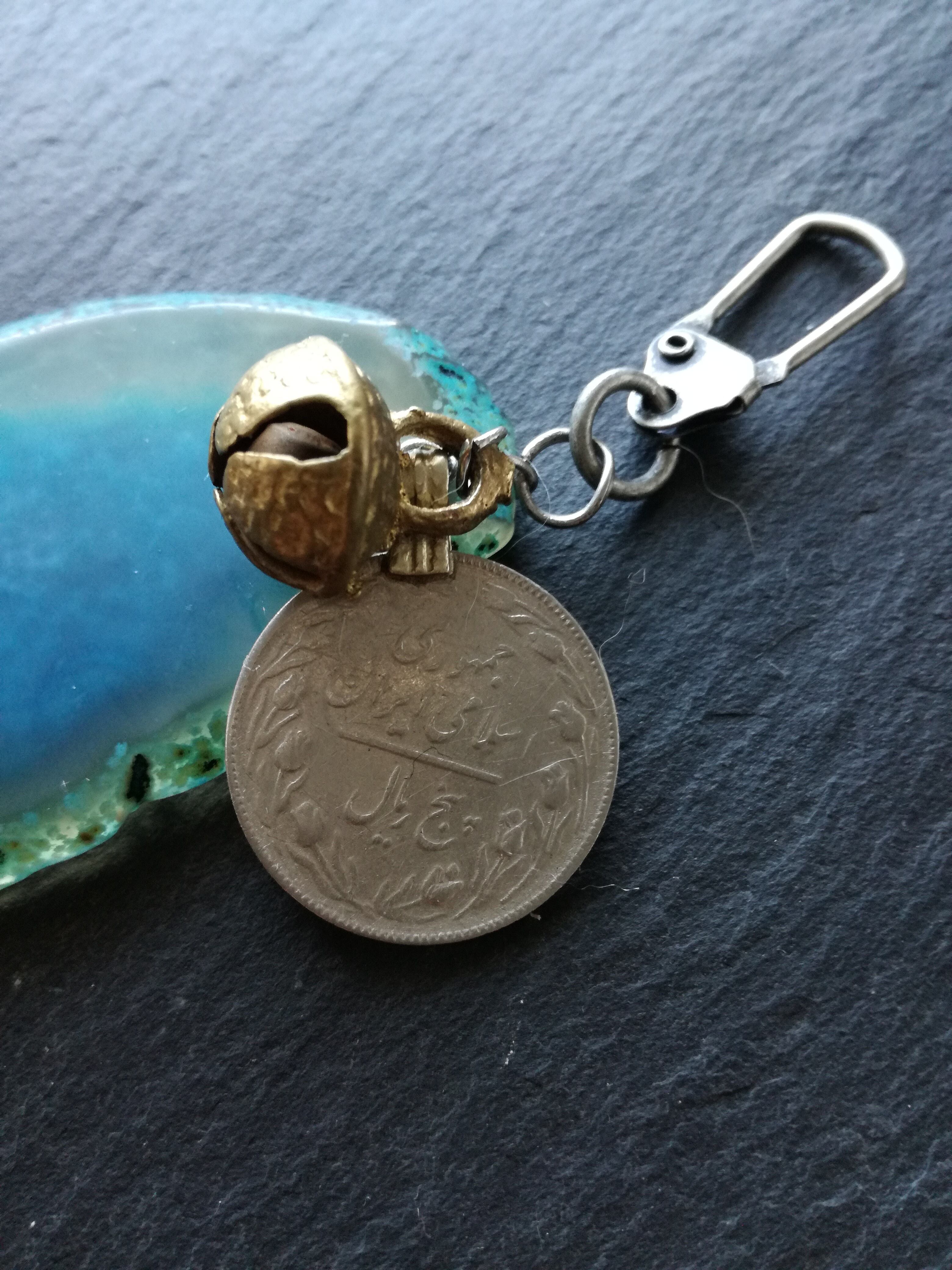 宇宙を想像させるような鮮やかなブルーが素敵な石や、異国情緒漂うウルドゥー古硬貨、渋く深みのある印象の鈴が融合して醸し出す独特の雰囲気がとても素敵です。