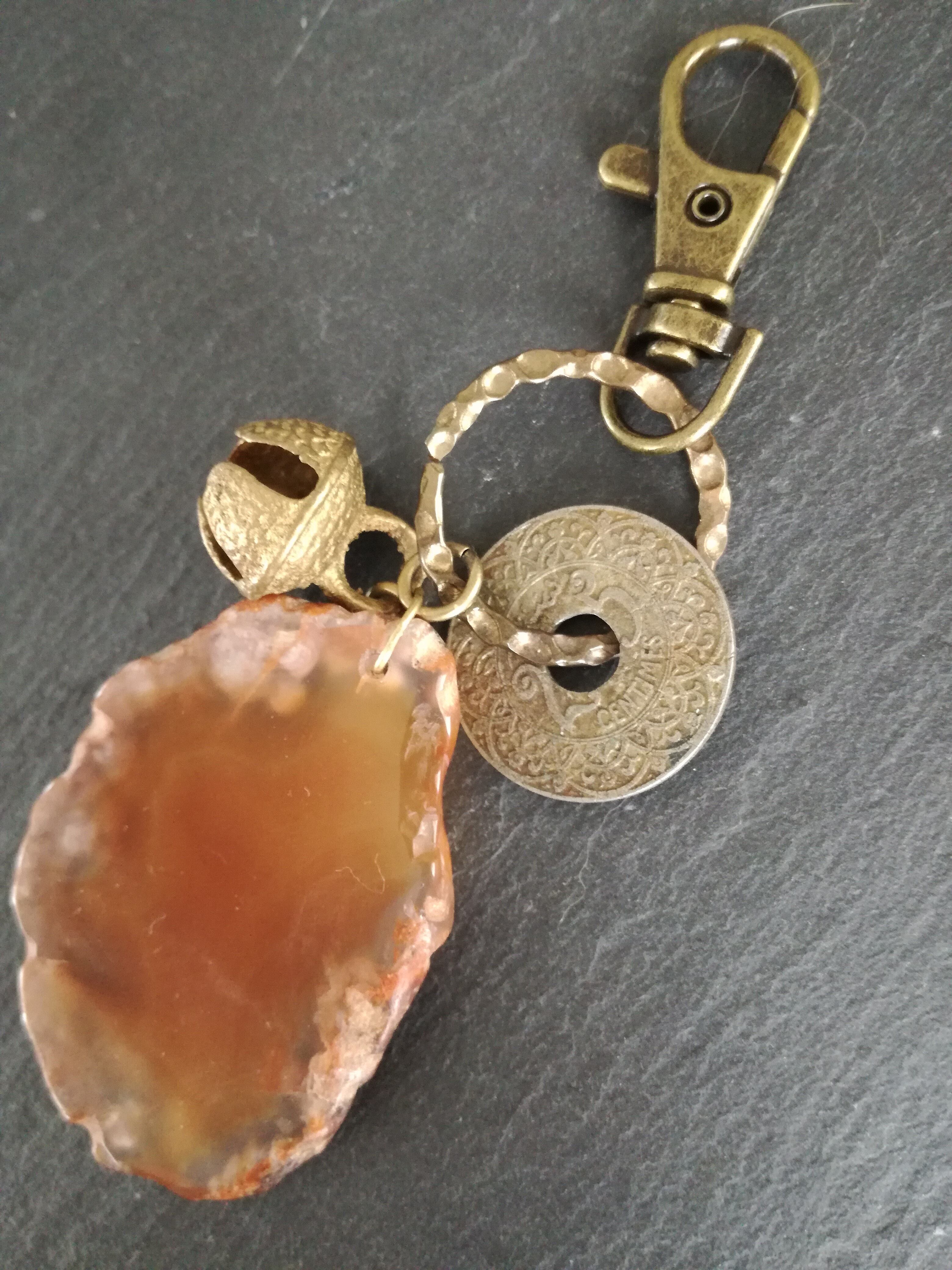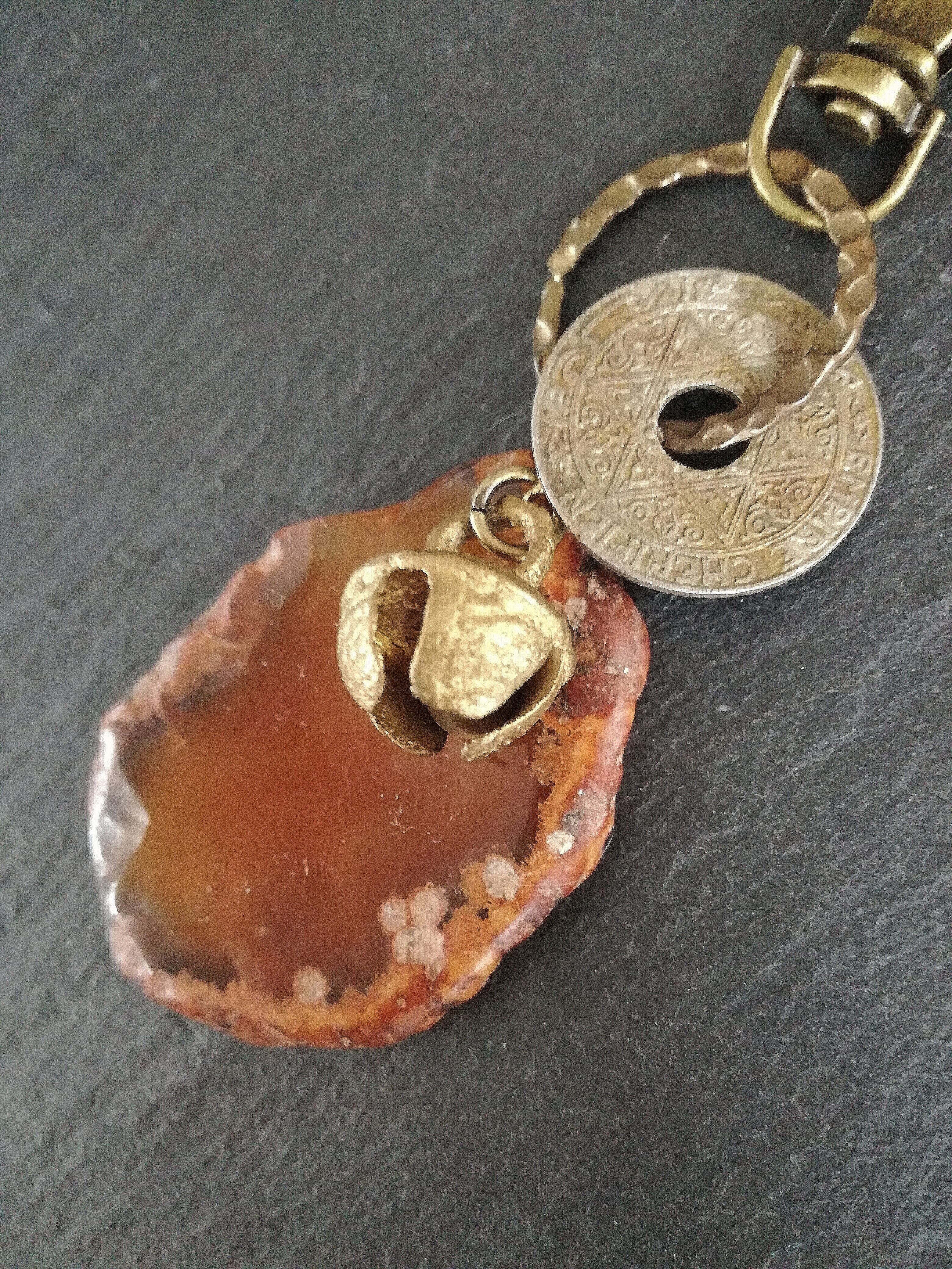 渋い橙の色合いが印象的な石と、味わい深い古さと異国情緒が漂う古硬貨、心地良い音色を響かせるインドの鈴が調和した素敵な作品です。