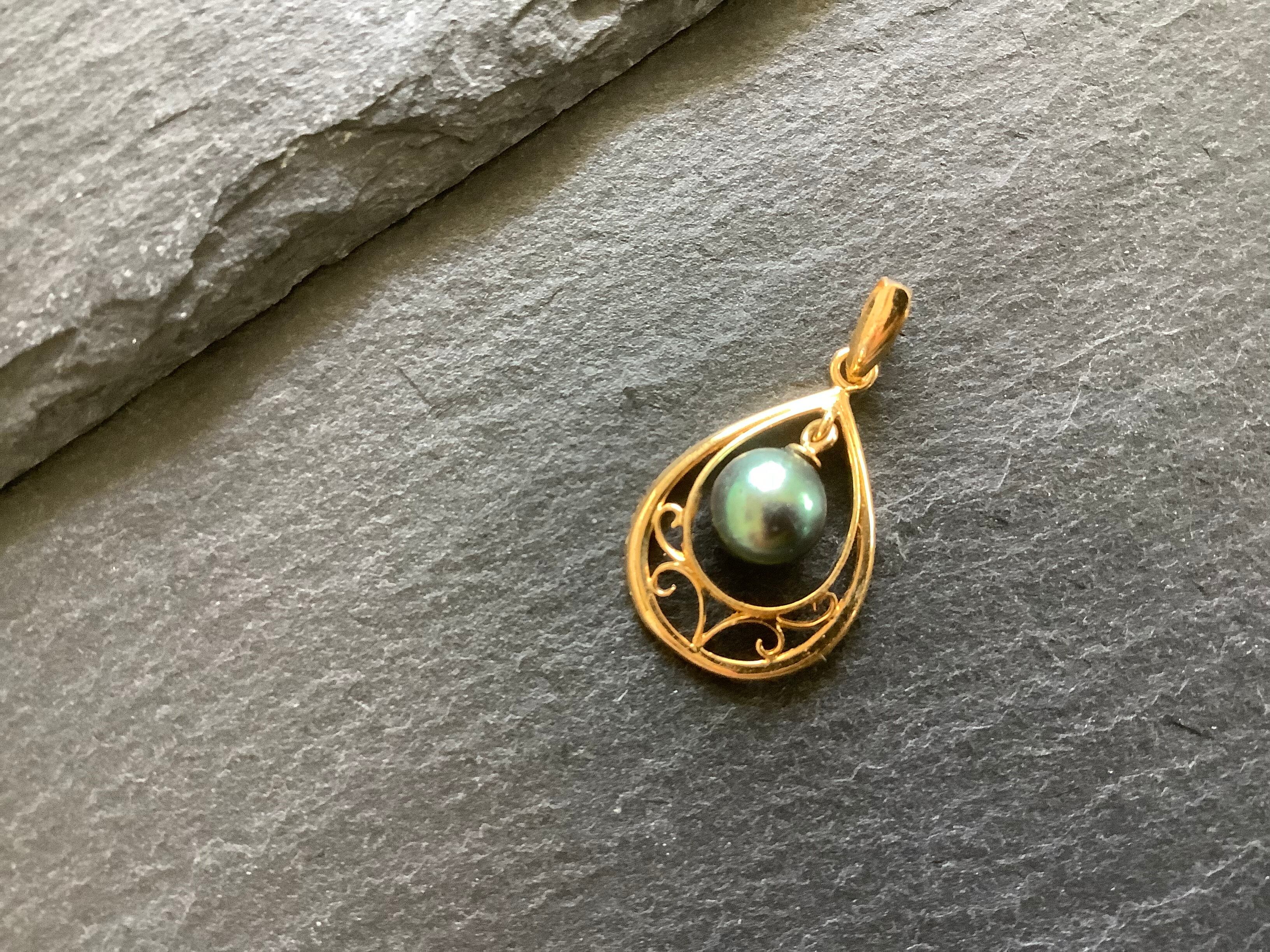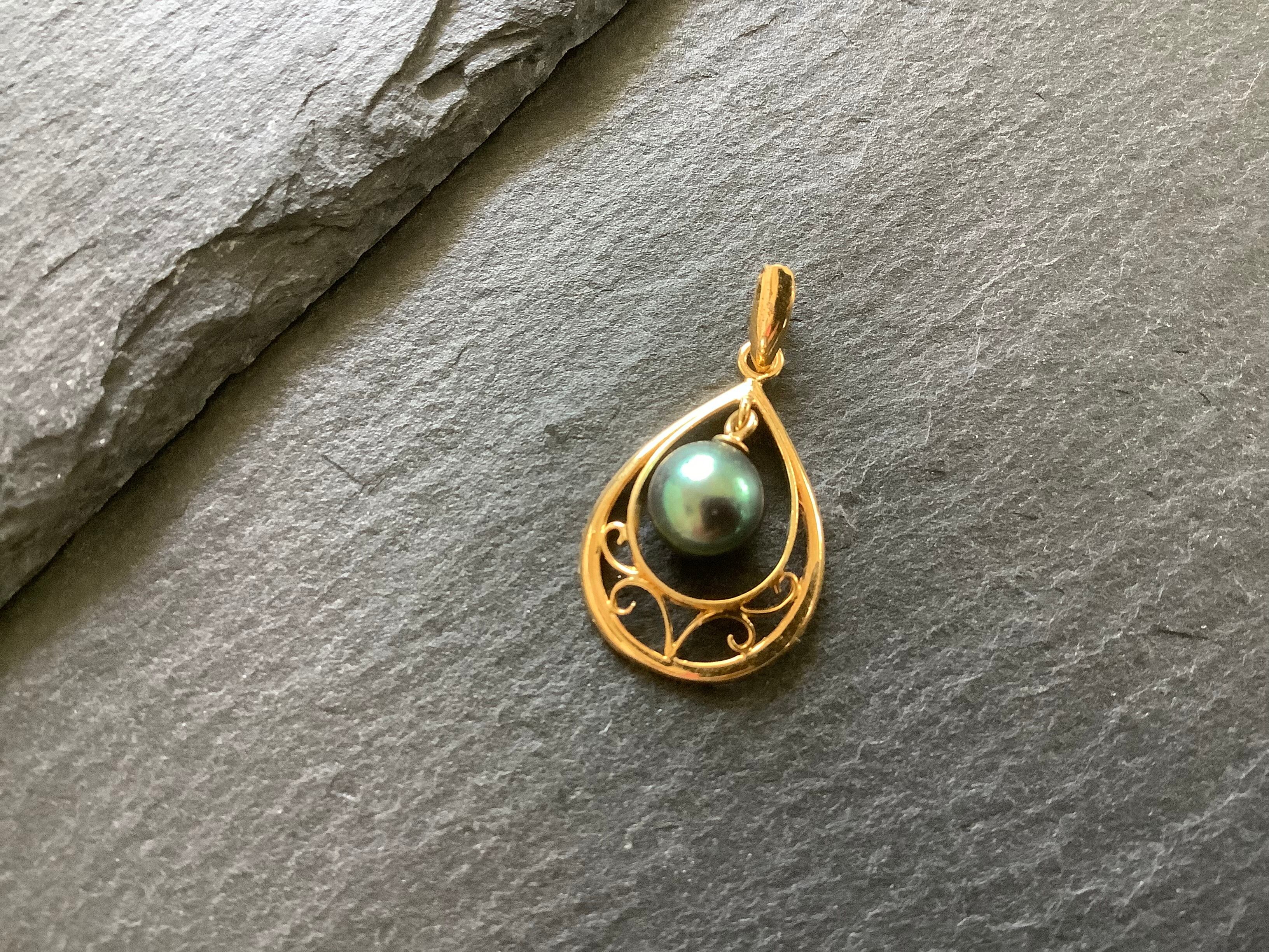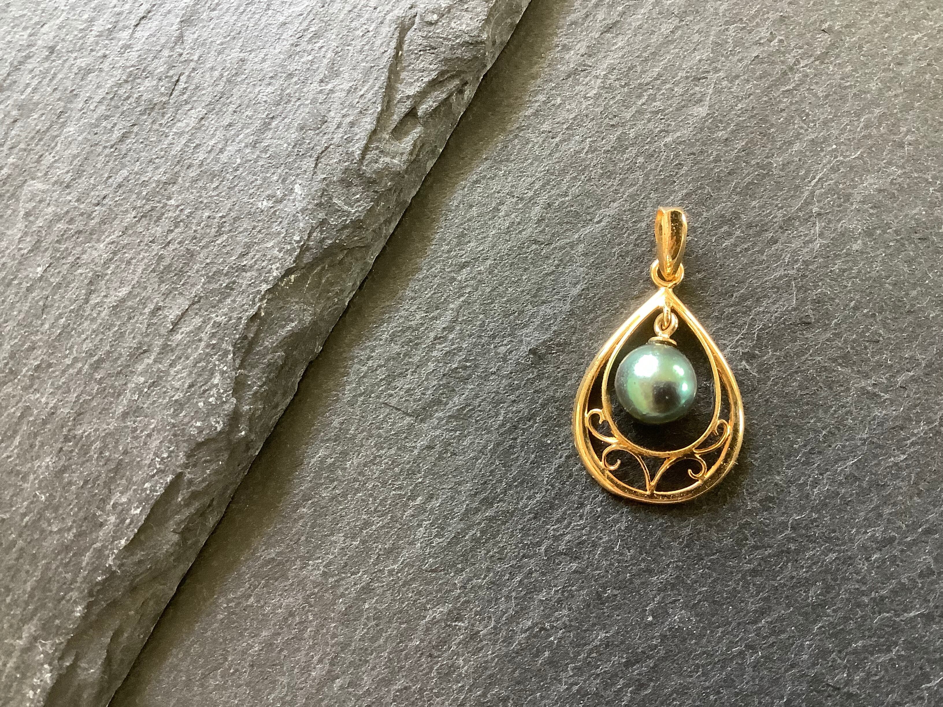 K18 深翠の本真珠と唐草模様の雫ペンダントトップ